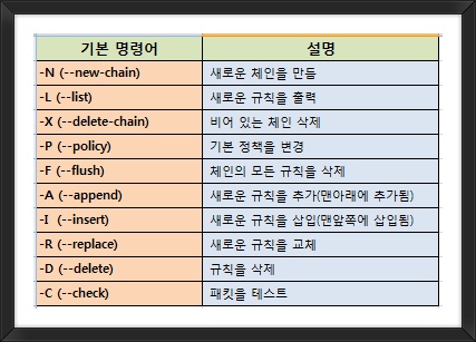 (기본 Chain은 영구적이며 삭제가 불가능하다. 이외에 -N 옵션으로 지정하는 사용자 정의 Chain이 있다.)
