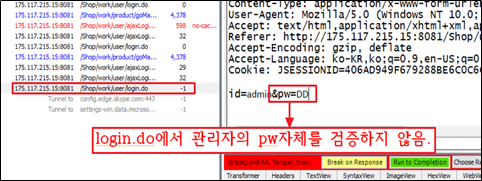 프록시로 로그인이동 경로를 확인한 결과 login.do부분에서 “Id=admin&pwd=DD”/pwd자체를 검증을 하지않아 공백을 넣어도 관리자페이지에 접근이 가능하다는 것을 알 수 있었다.