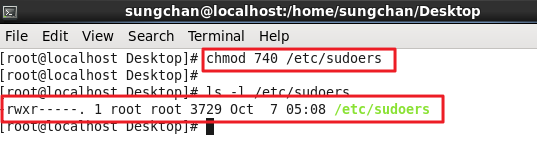권한을 부여하기 전에 /etc/sudoers에 권한 확인을 해보자 그 결과 /etc/sudoers는 중요 파일이기에 root권한도 'r' read 권한 밖에 주어지지 않는다. 이제 chomd를 이용하여 권한을 부여하자.