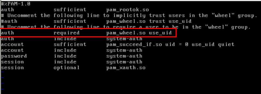 root권한으로 vi /etc/pam.d/su파일에 접근하여 해당 부분에 주석처리를 없애주자.