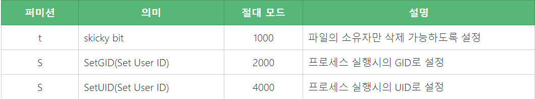 그림과 같이 0755에서 0이 특수권한을 의미하는 부분이다. 여기에 setuid,setgid,sticky bit를 설정 할 수 있다.