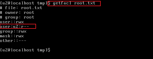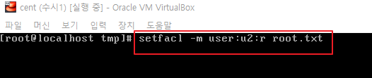 setfacl -m user:u2:r root.txt명령어로 통하여 해당 u2라는 계젱에 읽기(r)권한을 부여하자.