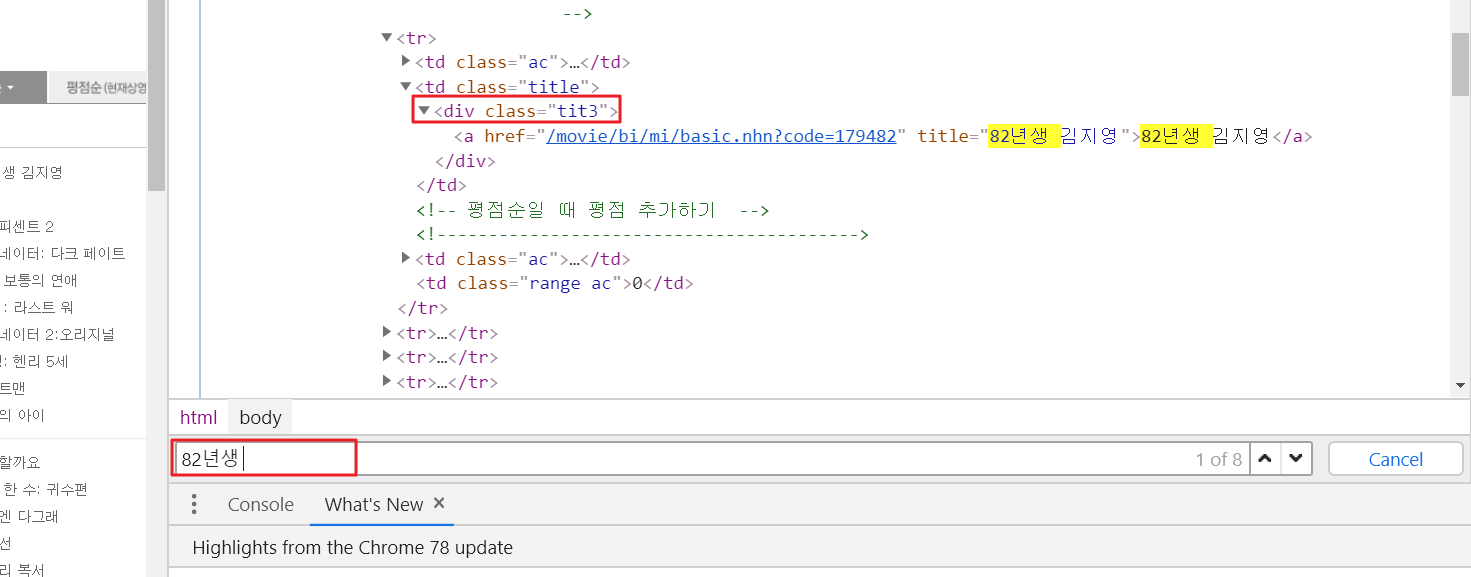 개발자도구로 들어가서 먼저 영화 제목을 입력해보자 그럼 <div> 태그안에 해당 영화 제목이 있는 것을 알 수 있는데 우리는 이 <div>태그를 이용해서 해당 영화 목록을 크롤링해볼 거다.