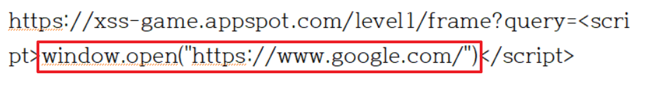 위 그림과 같이 URL주소에 <script>구문을 삽입한 주소가 있다. 여기서 우리가 생각해 볼 것은 window.open()안에 있는 구글 주소가 진짜 구글 주소가 아닌 해커가 만든 가짜 구글(파밍 사이트)이라고 가정해보자. 그러면 우리는 이 해당 주소를 복사를해 SNS,메시지,이메일,카XX톡 등으로 특정 사용자에게(친구,직장 상사 등)에게 보낸다.