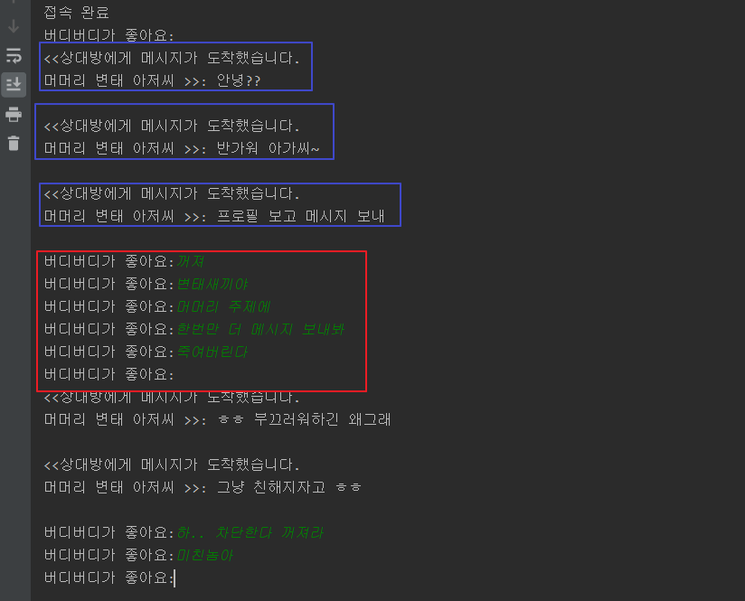자 이제 클라이언트에서 서버(머머리)가 보낸 메시지가 온것을 확인 할 수 있다. 이젠 클라이언트에서 서버로 메시지를 보내보자.