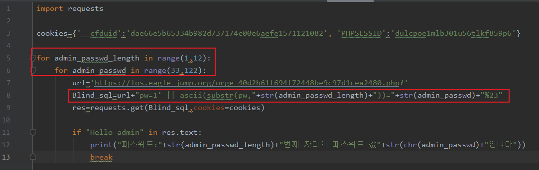 첫번째 for문은 패스워드 길이를 알기위함이다, 보통 패스워드 길이가 12~13자리이니 range(1,12)로 설정하자
