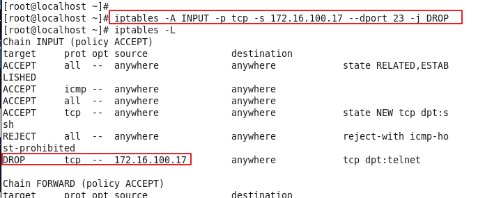 iptables -A INPUT -p tcp -s [특정 ip주소] --dport 23 -j REJECT