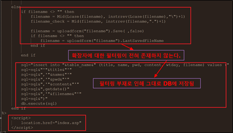 /security/4/index.asp파일에 있는 소스코드 분석 결과 파일업로드를하였을 경우 확장자 필터링 부재로 인하여 필터링이 전혀 이루어지지 않은 상태이며 이로 인하여 그대로 DB에저장이 되는 것을 볼 수 있음.