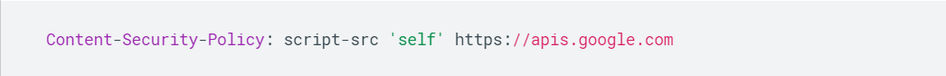 self를 이용하여 스크립트의 한 가지 유효한 소스로 지정한다. https://apis.google.com 또한 유효한 다른 소스로 지정한 것을 알 수 있다. 브라우저는 현재 페이지의 출처뿐 아니라 HTTPS를 통해 apis.google.com에서도 제공되는 자바스크립트를 다운하고 실행한다.