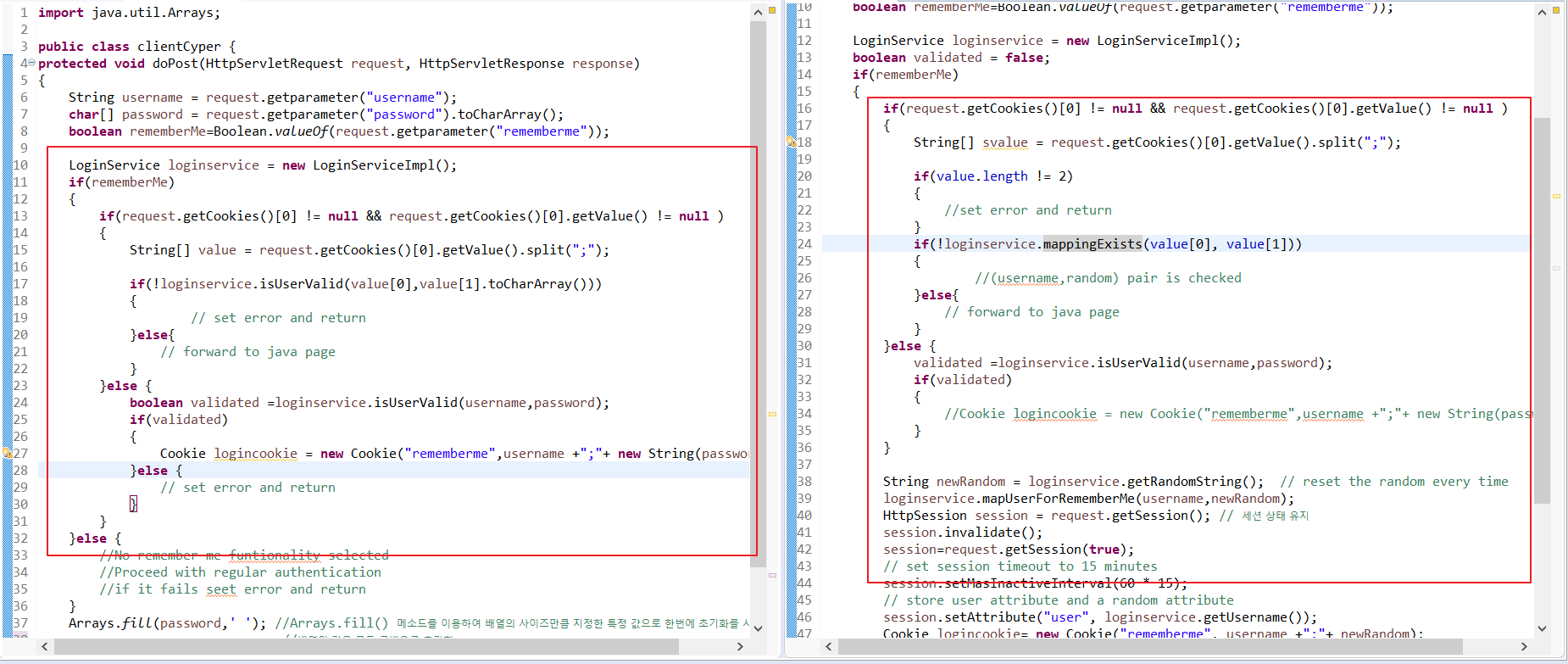 서버는 사용자 이름과 안전한 랜덤 문자열과의 짝을 유지한다. 사용자가 "remember-me"를 선택하면 doPost()메소드는 제공된 쿠키가 유효한 사용자 이름과 짝이 되는 랜덤 문자열을 포함하고 있는지 검사한다.